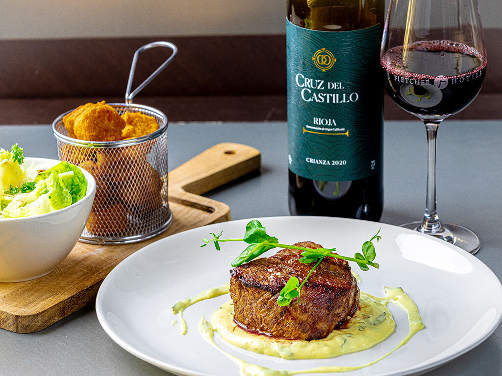 Combineer dit gerecht met Cruz del Castillo Rioja Crianza. Een evenwichtige rode wijn met tonen van rijp rood fruit en vanille, gerijpt op Amerikaans eiken. Een perfecte aanvulling op de rijke en intense smaak van de tournedos.